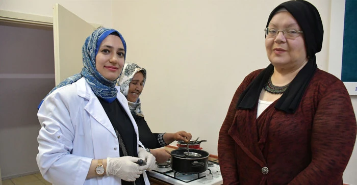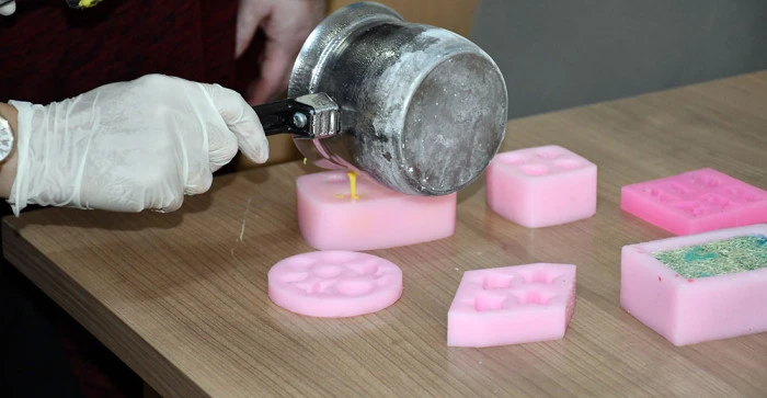 Kurs öğreticisi Sümeyye Arslan, doğal sabunların yapım aşamalarını da ayrıntılarıyla anlattı. Kurs kapsamında tamamen bitkisel yağlardan üretilmiş sabun bazları kullanılıyor ve üretimde kimyasal maddeye kesinlikle yer verilmiyor. Arslan “ Doğal sabunlarımızı üretirken bitkisel yağlardan üretilen sabun bazlarımızı kullanıyoruz. Bu bazlarımızı ocakta belirli sıcaklıklarda eritiyoruz. Direk ocağa temas etmiyoruz. Erittikten sonra bunlara doğal koku ve doğal renk ekliyoruz. Bunları da dijital termometre yardımı ile belirli santigrat derecelerde eklemelerini yapıyoruz. Daha sonra renklendirme ve kokulandırma yaptığımız sabun bazımızı kalıplara döküm aşamasına geçiyoruz. Bu süreçten sonra kalıpta soğuma ve bekleme süreci var. Kalıpta soğumaya bıraktıktan sonra belirli süreden sonra kalıptan çıkarma aşaması var. Kalıplardan çıkartıp sabun yapımını tamamlamış oluyoruz. İçeriği tamamen dediğimiz gibi doğal ve sabun bazlarımız, bitkisel yağlardan üretilmiş. Bunlara doğal renk ve kokuları ekliyoruz. Sabunlarımızın temizleme gücü çok iyi marketten aldığımız sıvı veya katı sabunlar gibi değil. Buraya gelen hanımlar kendi doğal sabunlarını elde etmiş oluyorlar. Aynı zamanda bunlar birer oda kokusu niteliğinde hem görsellik hem de mis koku saçıyor etrafa” dedi.
