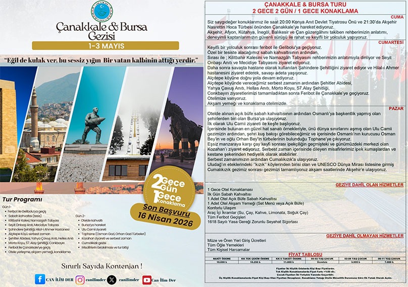 Cankurtaran İlim Kültür Sanat Yardımlaşma ve Dayanışma Derneği (CAN-İLİM-DER), 1-3 Mayıs tarihleri arasında Çanakkale ve Bursa’yı kapsayan gezi programı düzenliyor.