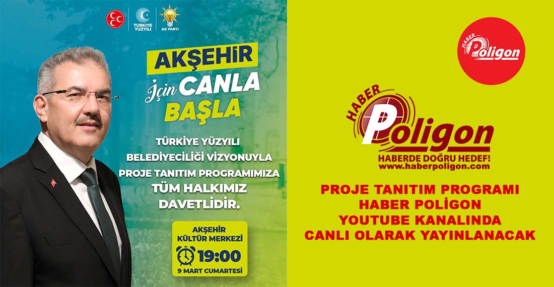 Cumhur İttifakı Akşehir Belediye Başkan Adayı Yusuf Kahramanın bugün yapacağı proje tanıtım toplantısı Haber Poligon Youtube Kanalında canlı olarak yayınlanacak.
