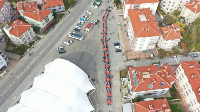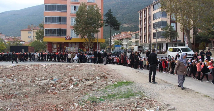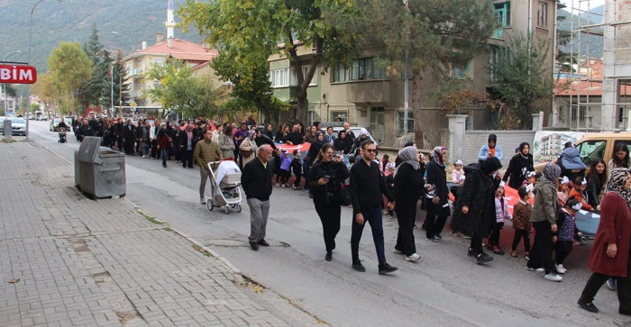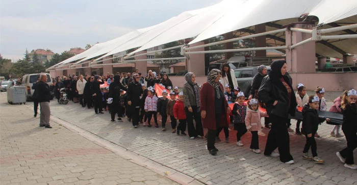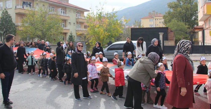 Etkinliğin zirve noktası, tam 87 metre uzunluğundaki dev Türk Bayrağı eşliğinde gerçekleşen kortej yürüyüşü oldu. Geleceğin teminatı olan minicik eller, bayrağın her bir santimini gururla taşırken, velilerin de katılımıyla oluşan bu coşkulu zincir, adeta Ata'nın mirasına sahip çıkmanın en güzel tablosuydu.Minik öğrenciler, Okul Müdürü Hasan Külcü, öğretmenleri ve velileri ile birlikte polis araçları eşliğinde gururla yürüyüşlerini gerçekleştirdiler.